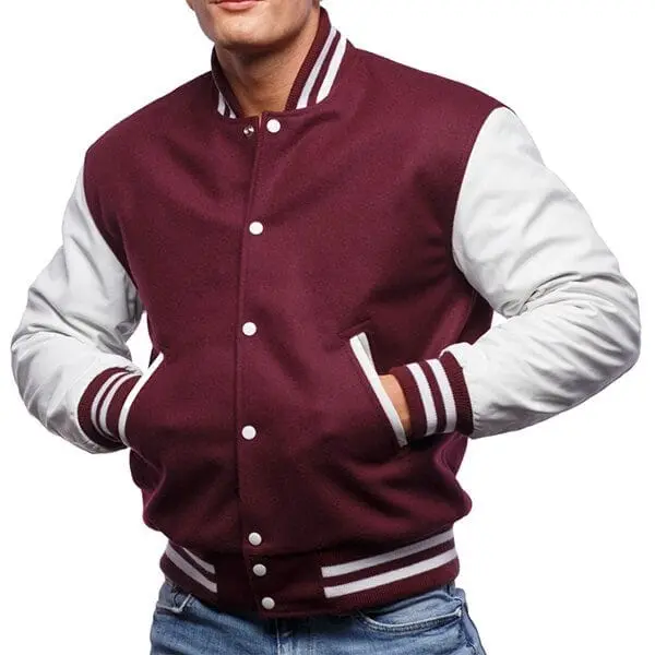 Maroon Wool Letterman Jacket with crisp White Leather Sleeves – a timeless blend of classic charm and contemporary elegance. This isn’t just a jacket; it’s a fashion statement crafted for those who appreciate sophistication with a modern edge.