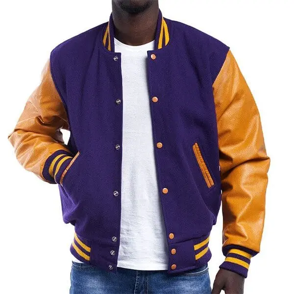 Purple Wool Letterman Jacket with vibrant Yellow Leather Sleeves – a bold and stylish ensemble that effortlessly combines classic charm with contemporary flair. This isn’t just a jacket; it’s a statement piece designed for those who crave individuality in their fashion choices.