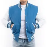 Sky Blue Wool Letterman Jacket With White Leather Sleeves
